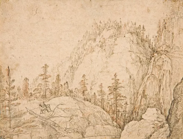 Work of ArtRoelandt SaveryA mountainous wooded landscape with two chamois, a waterfall to the rightafter 1606-07