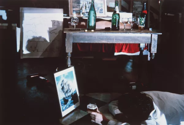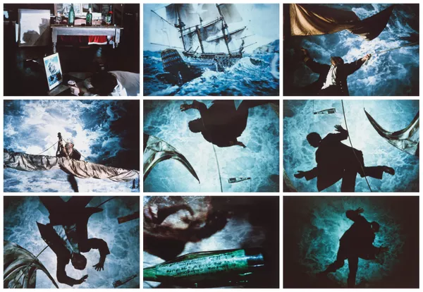 Frieze - three men - taller one in centre. Arms being restrained by "kneeling" men.