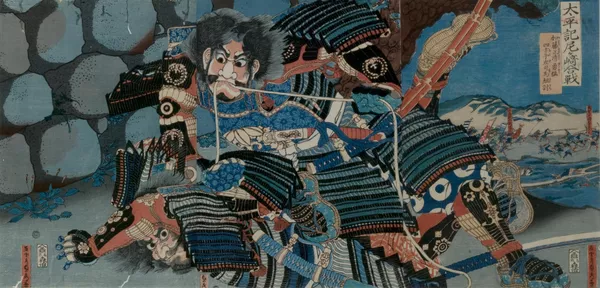 Kato Kiyomasa valiantly binds his enemy with a belt rope, from the story of 'Taiheiki'