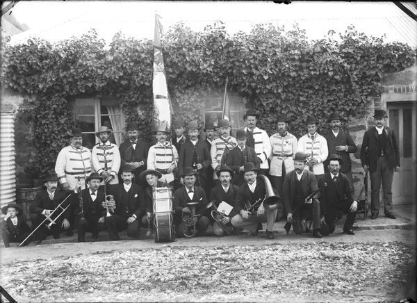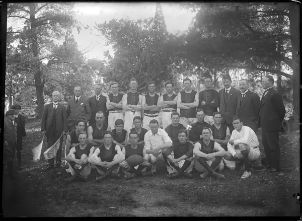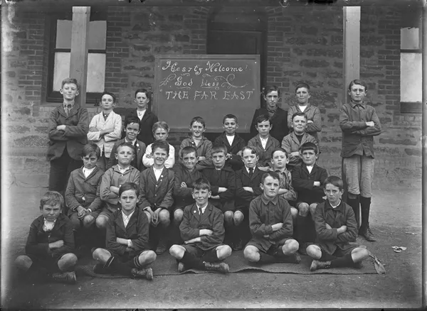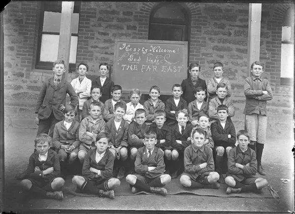 Work of ArtUnknownGroup portrait of boys, black board carrying welcome inscription at rearc.1910-20