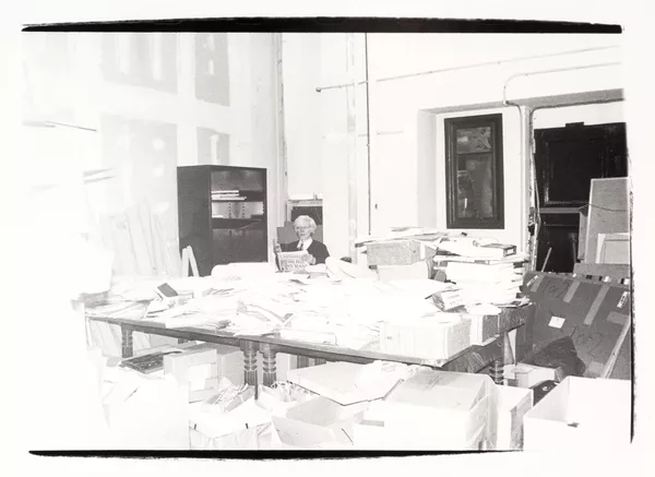 Andy Warhol with Brillo Box and Ruby the cat at The Silver Factory