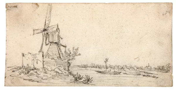 A windmill on a river bank