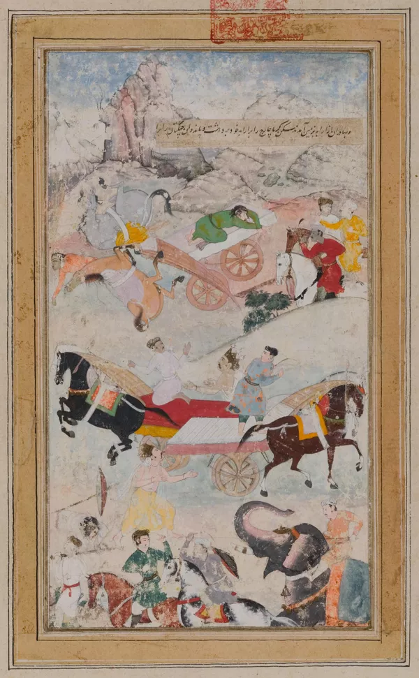 Battle scene from the 'Mahabharata' epic [recto]; 'Always they go on decorating the bride of time...' [calligraphy verso]