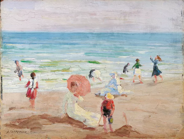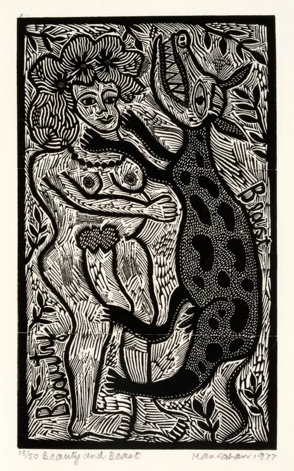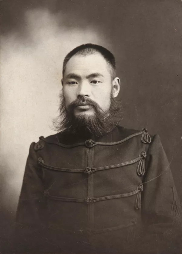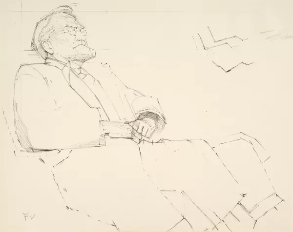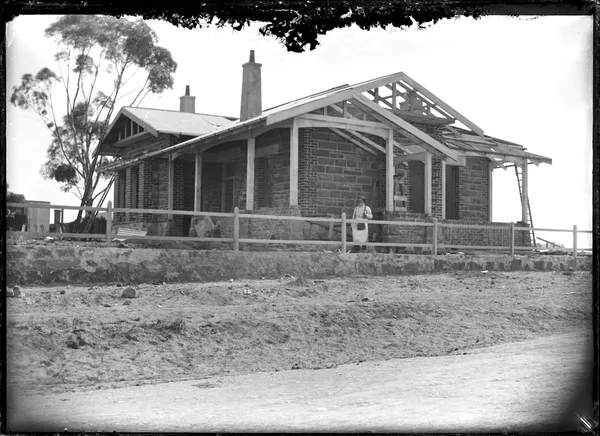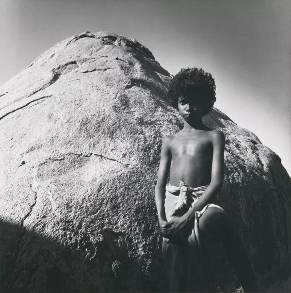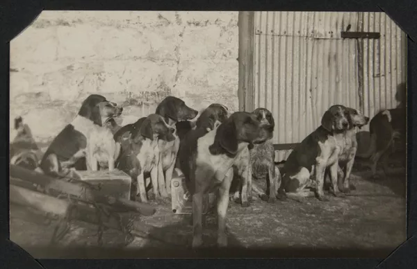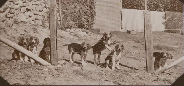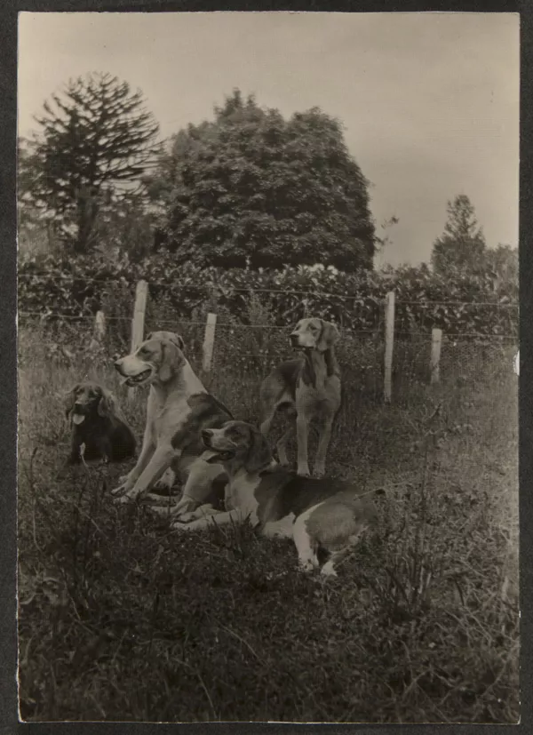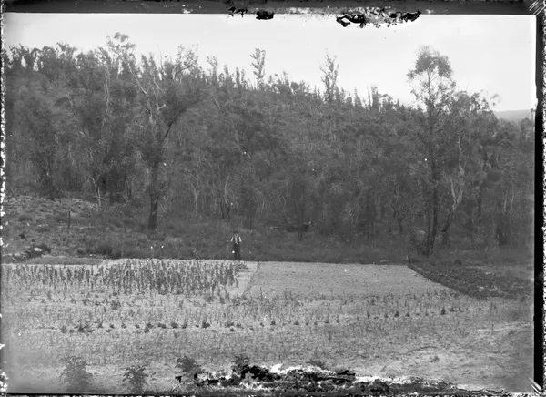 Bearded man with hat and spade in paddock, tree covered hill in background