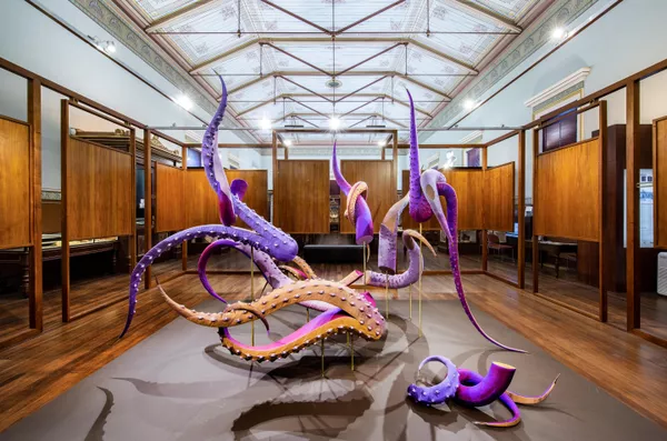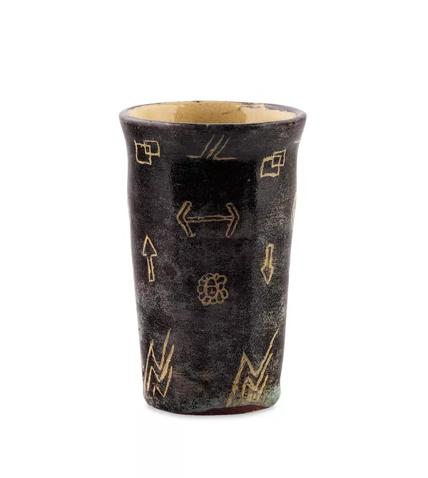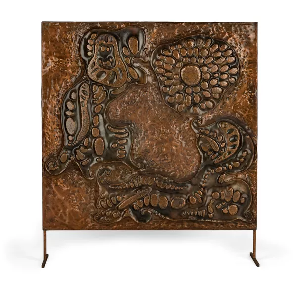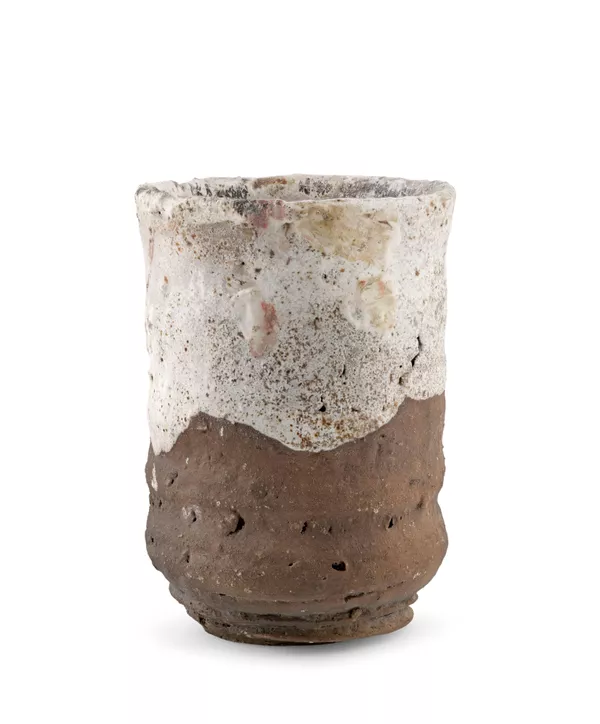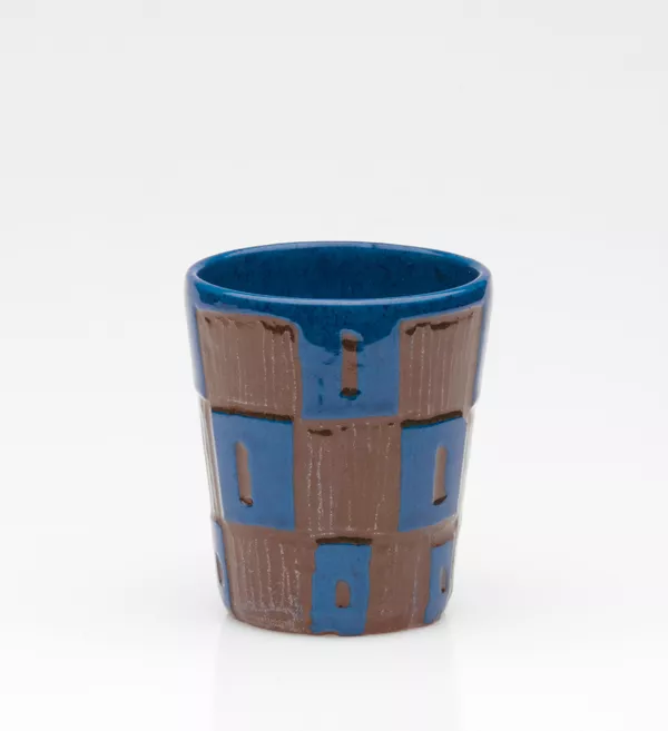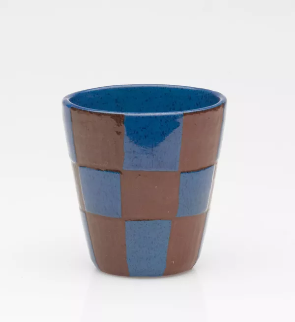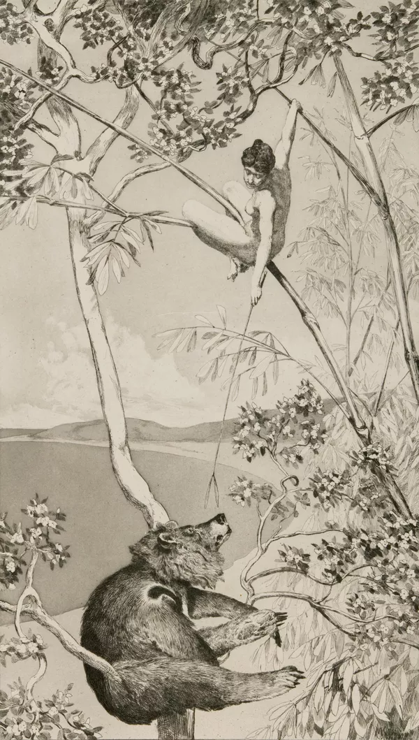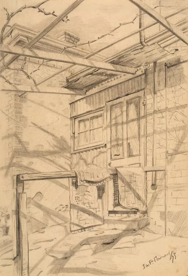 Bearded man with hat and spade in paddock, tree covered hill in background