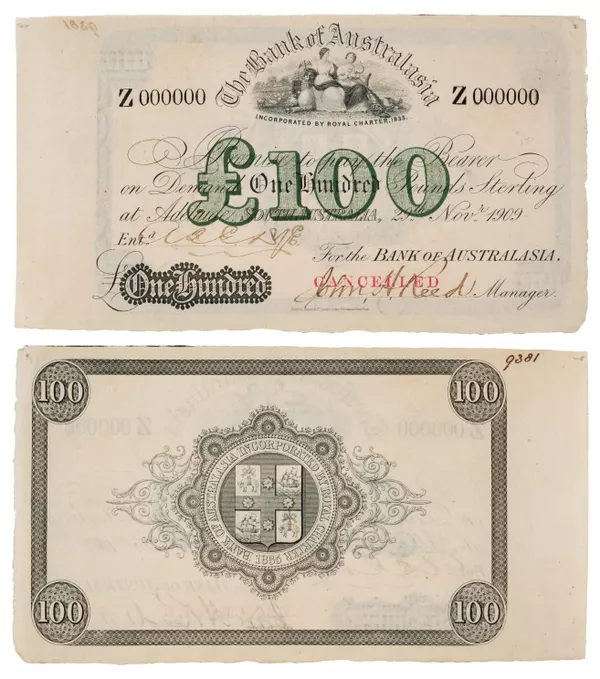 Bank of Australasia speciman one hundred pounds, bank note number Z000000