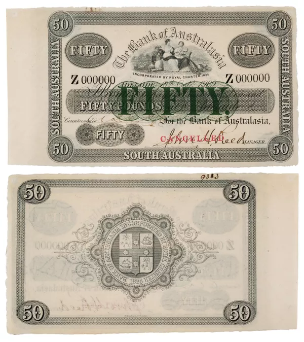 Bank of Australasia speciman fifty pounds, bank note number Z000000
