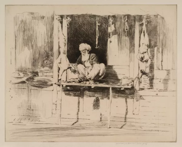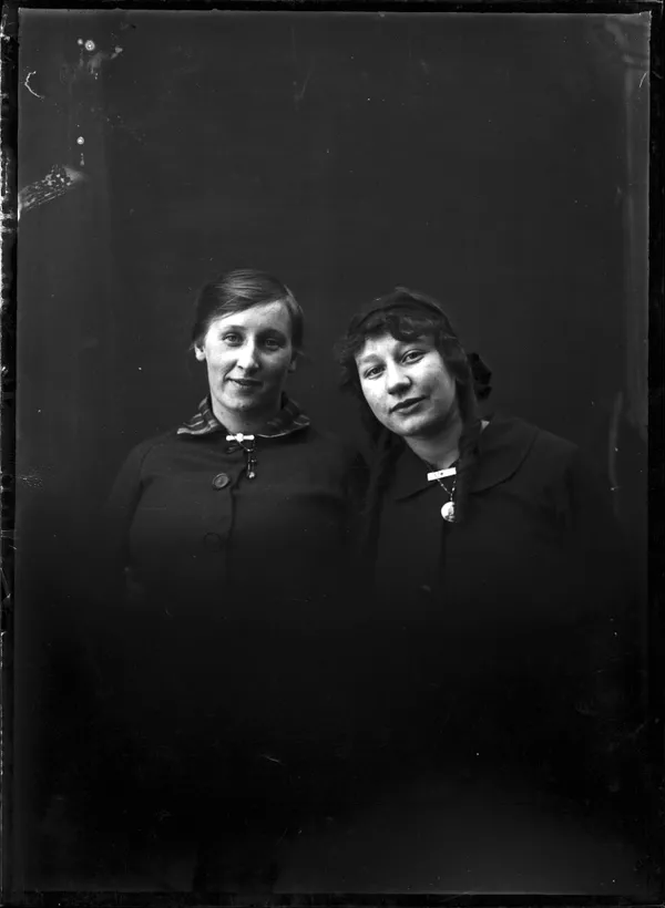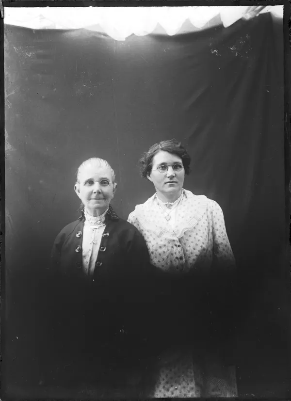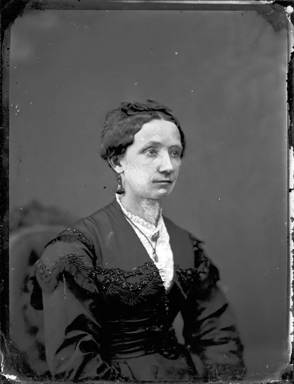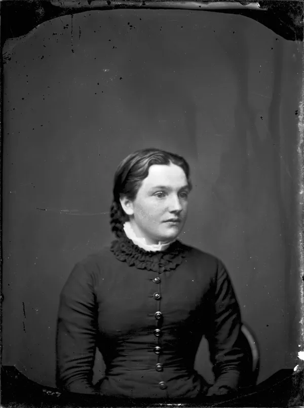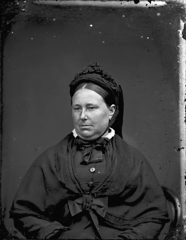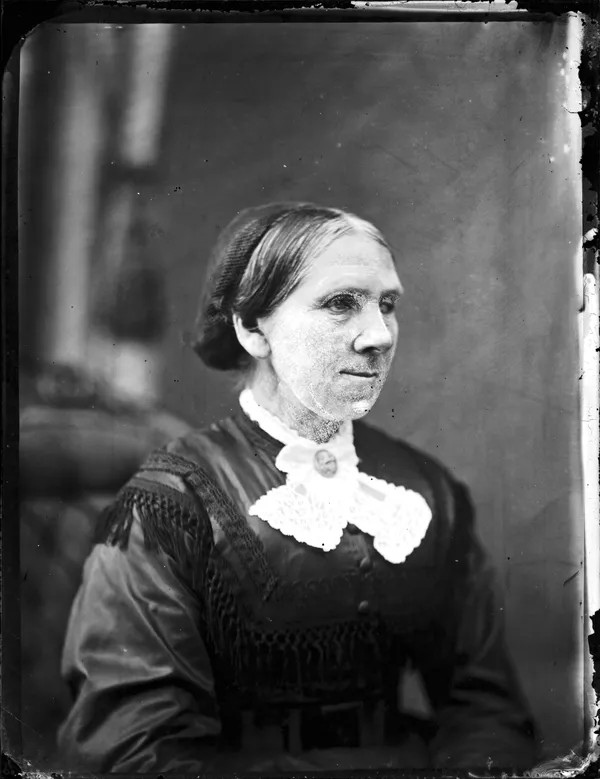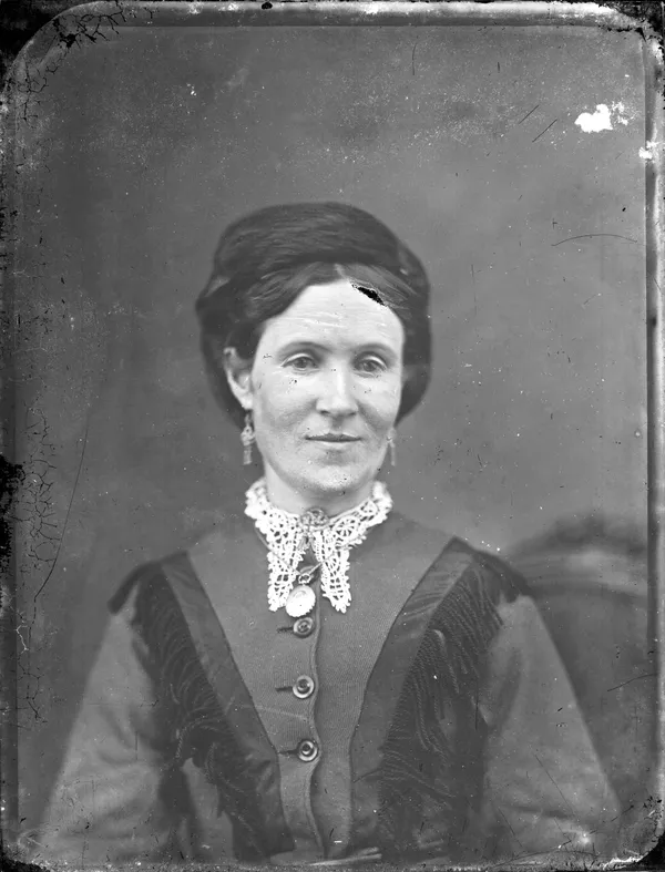 Bust portrait of woman wearing lace fichu fastened with brooch