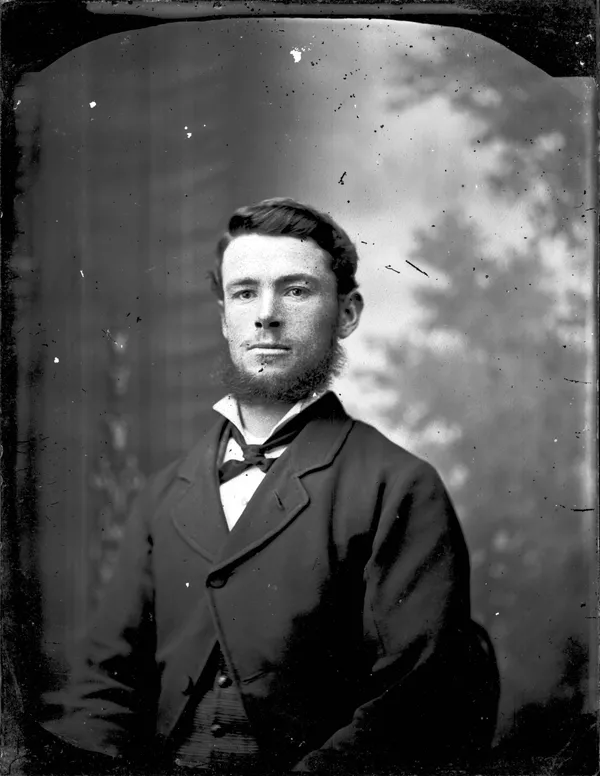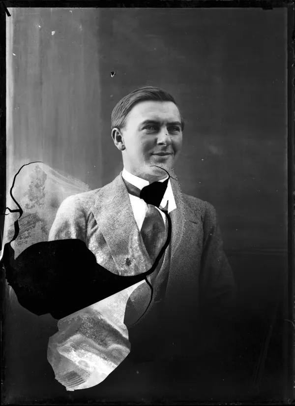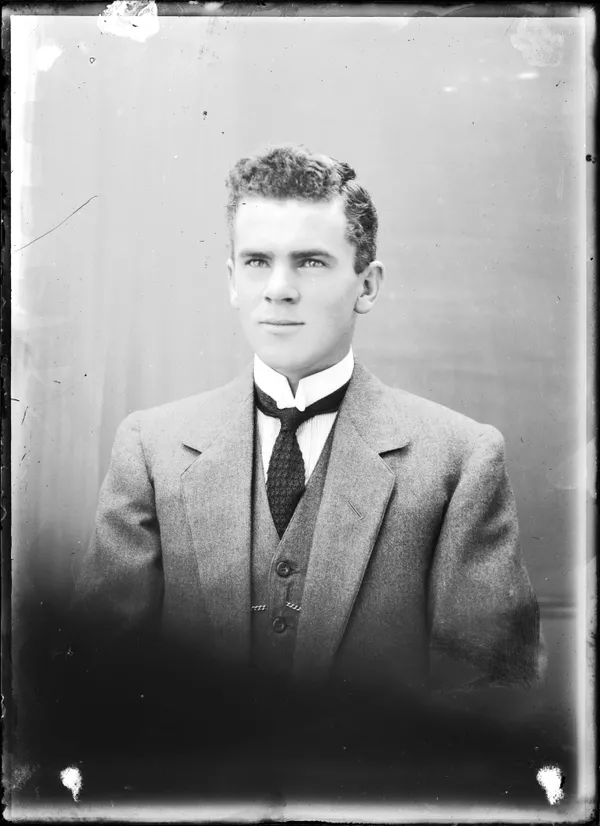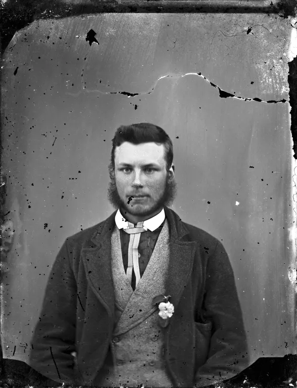 Bust portrait of young man wearing woollen waistcoat and flower at lapel
