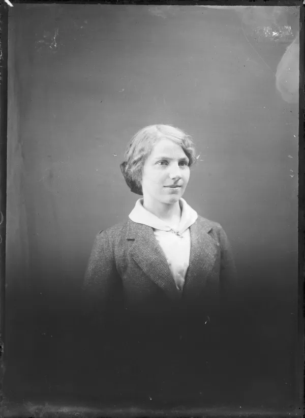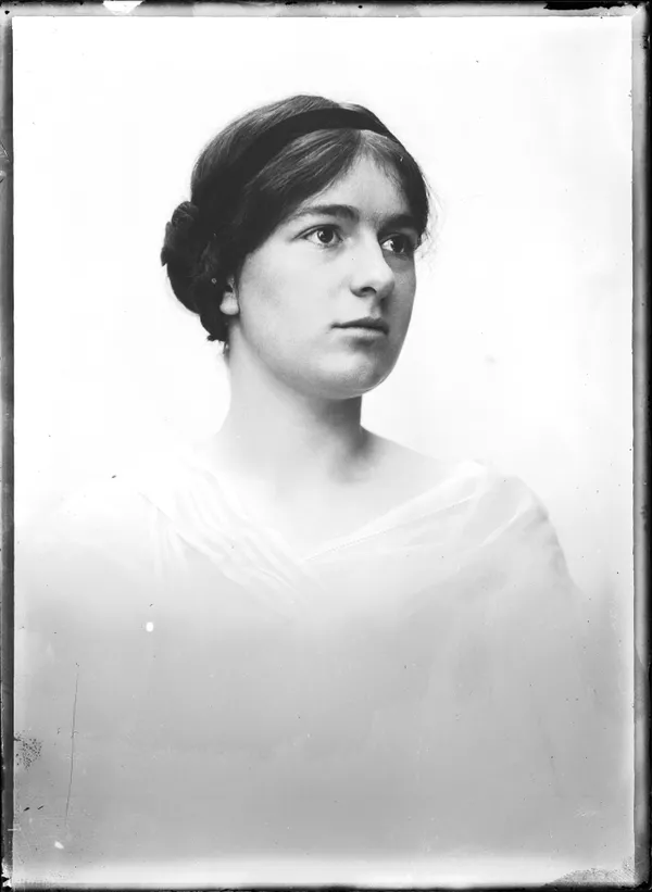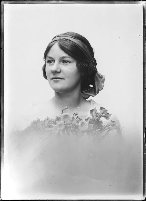 Bust portrait of young woman, flowers held at chest and ribbon worn in hair