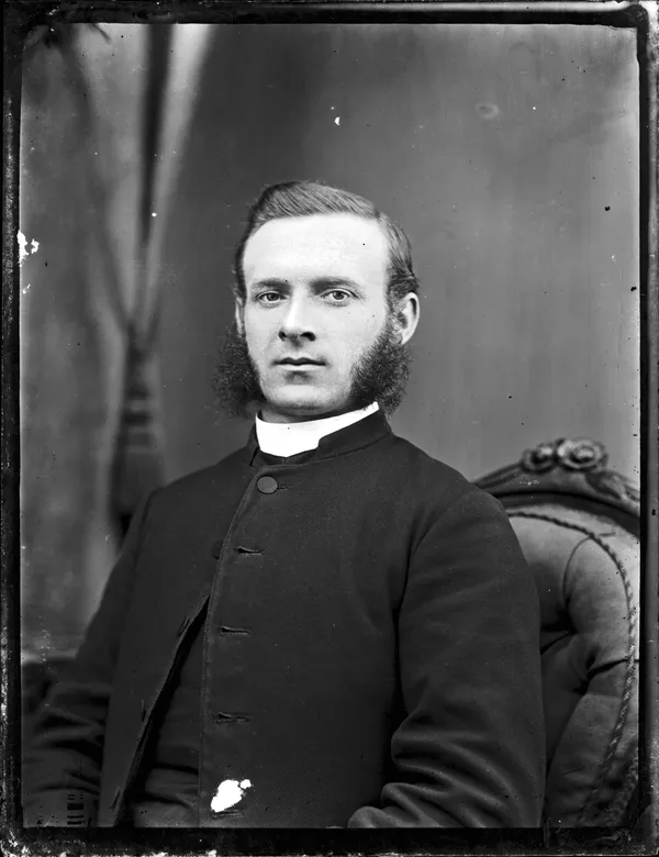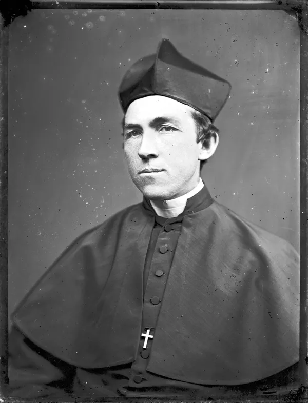 Bust portrait of young man in religious attire, crucifix worn around neck