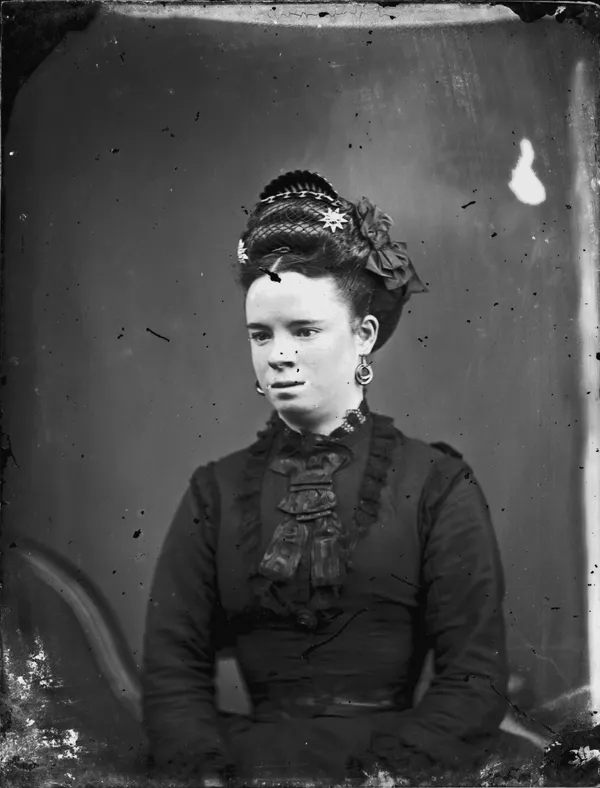 Bust portrait of young woman wearing comb, pins, bow at net in hair