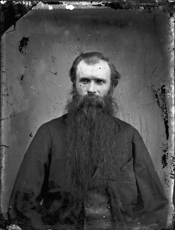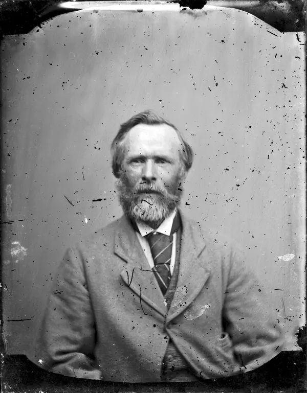 Bust portrait of gentlemen wearing striped tie and single breasted jacket