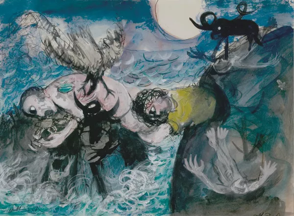 Bird, sun and ram above figure chained to rock
