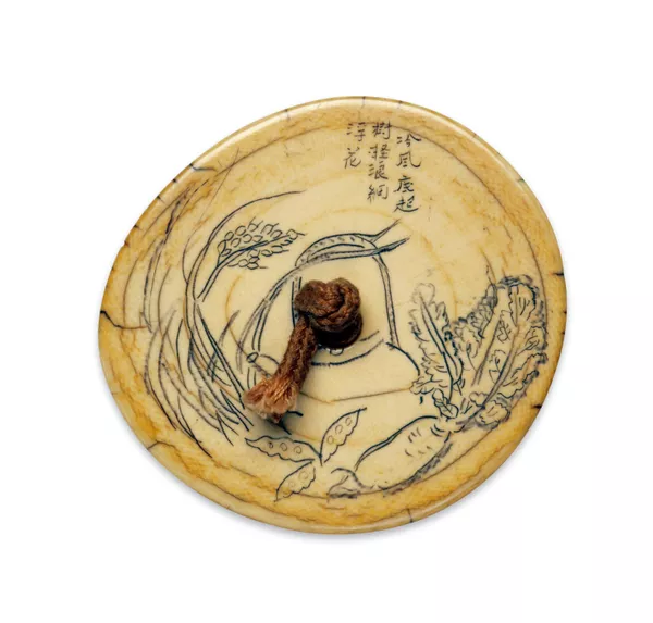 Work of ArtJapanNetsuke, Manju, radish, kettle, foliage (rice ears) and inscriptionlate 17th-early 18th century