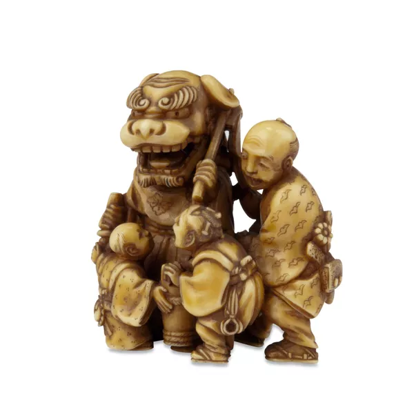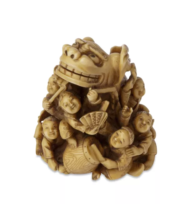 Work of ArtChosho (Asamatsu)Netsuke, Lion dancer with musician and Buddhist priestlate 19th century