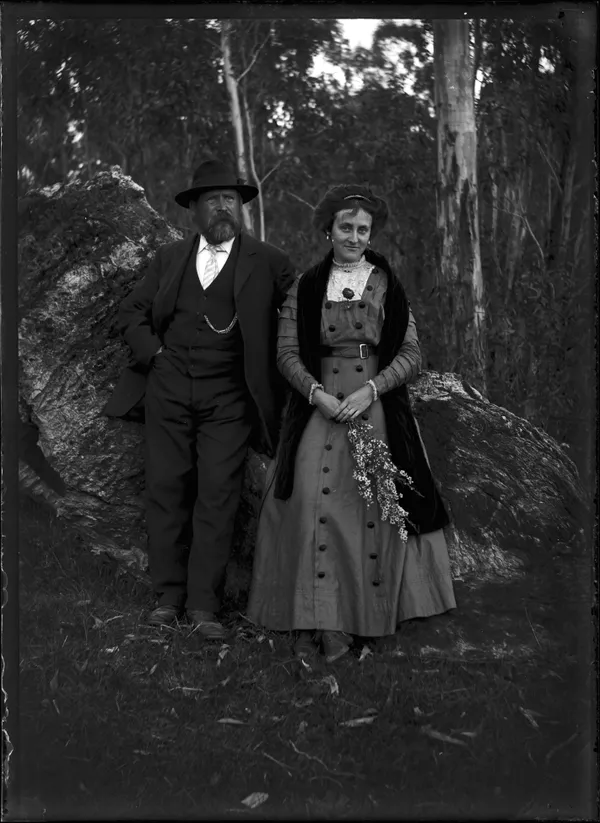 Couple posed against tree trunk in bush surround, woman with flower in hand