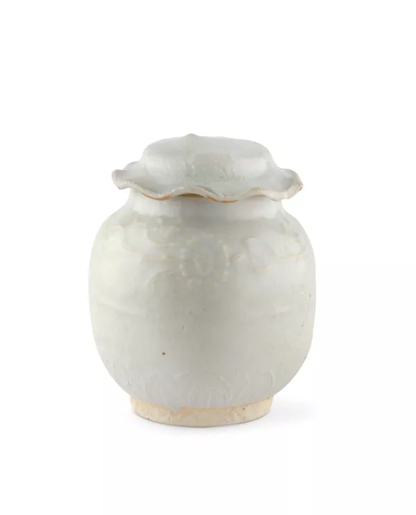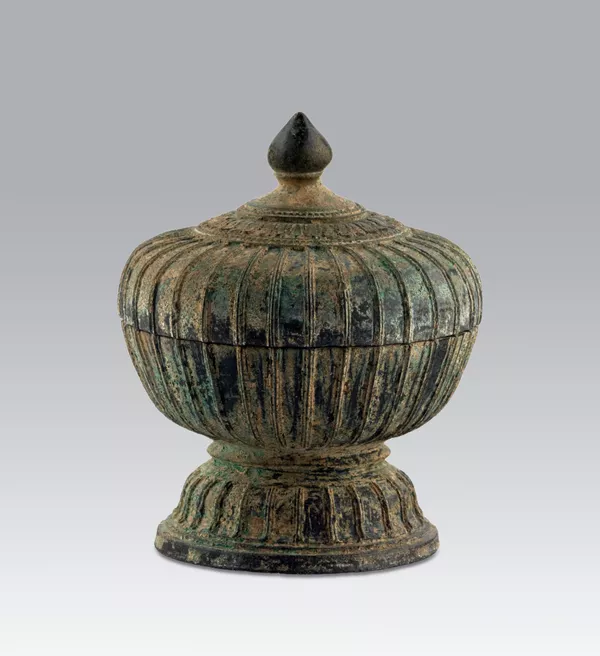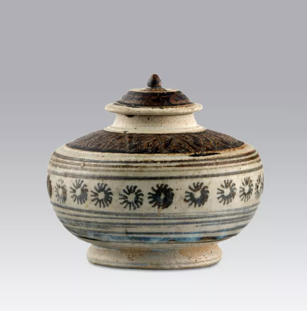 Covered box, with lotus bud handle and pendant collar, broad band of undulating vegetal scroll on body