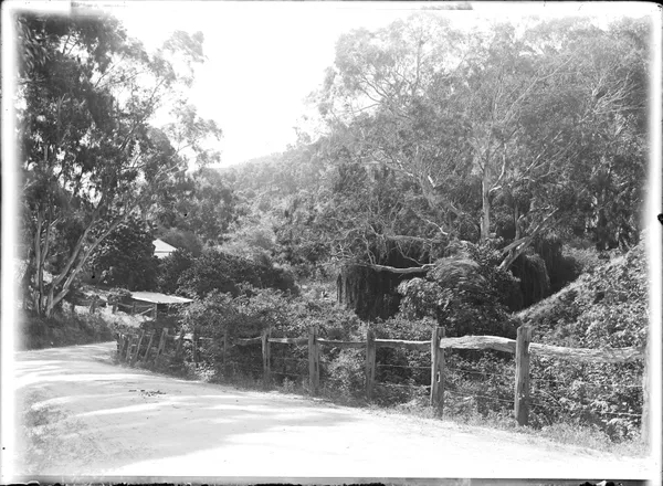 Work of ArtUnknownCurve of road followed by wood and wire fence, hillside ascending in distancec.1900-10