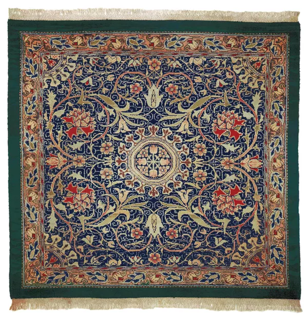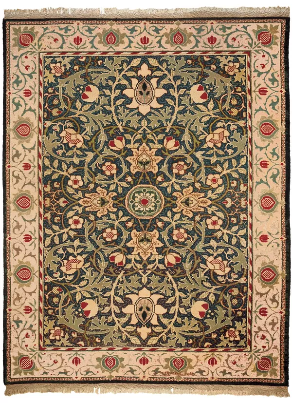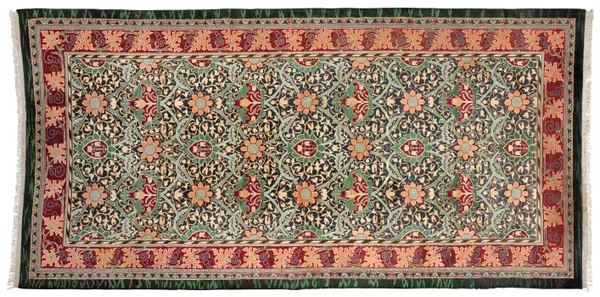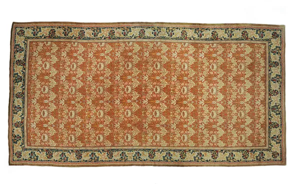 Carpet, with five large star motifs in central field and borders with geometric and floral motifs