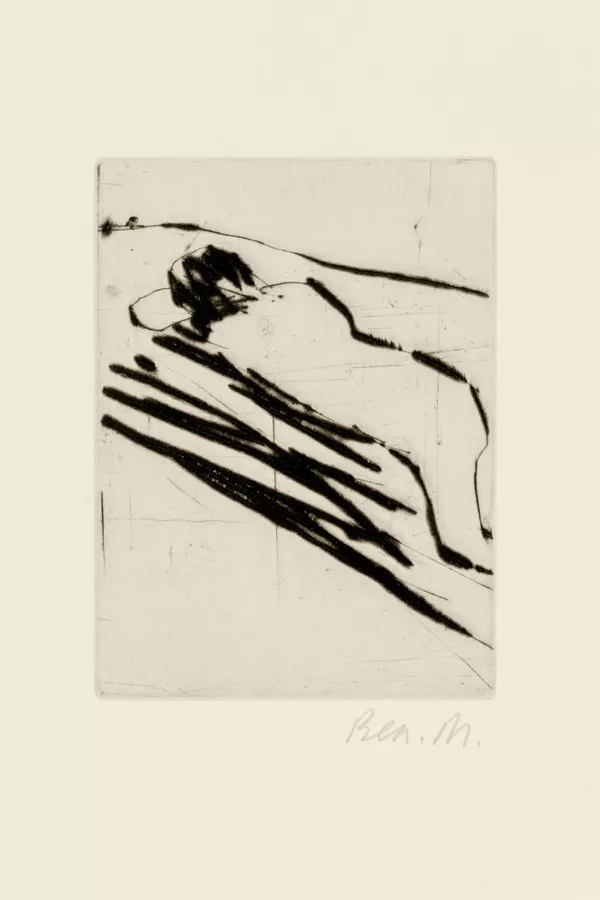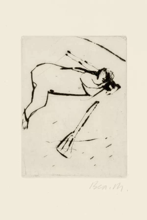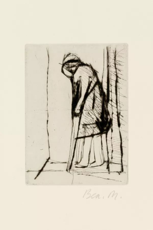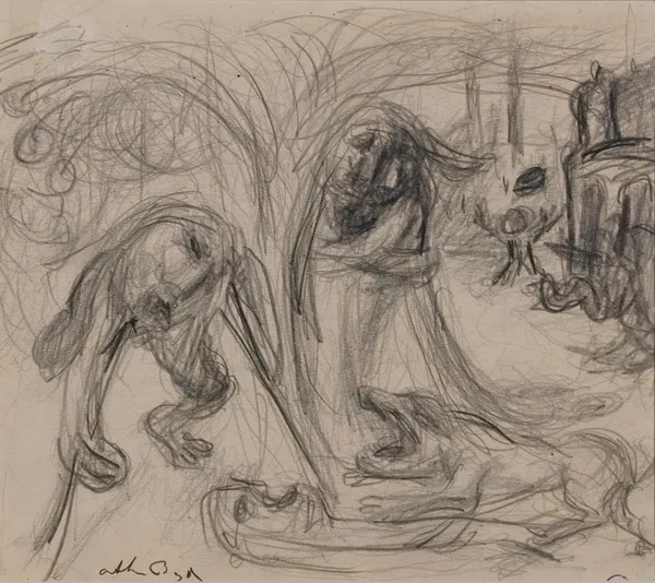 Cripple beneath tree with embracing figures, prostrate figure and dog