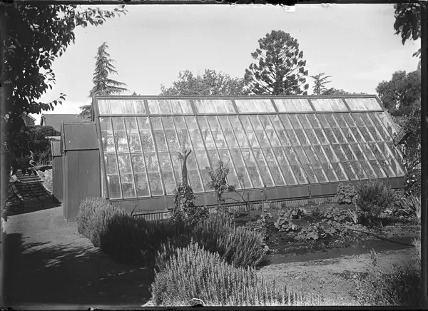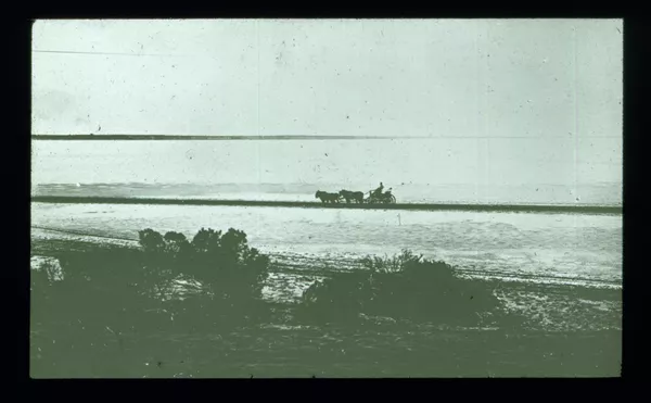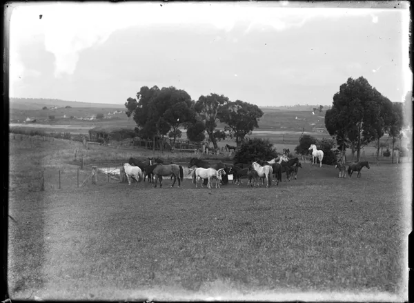 View of horse, wagon and man beside machinery, shrubbery in foreground