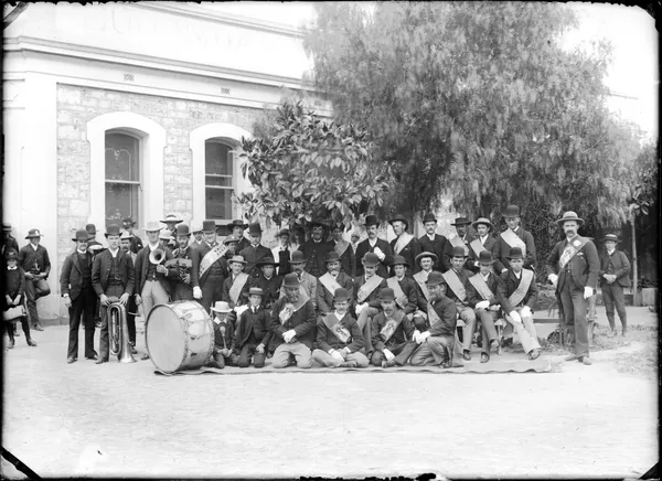 Work of ArtSidney Albert Boriston OatsGroup portrait of town band, stone building at rear1898-1936