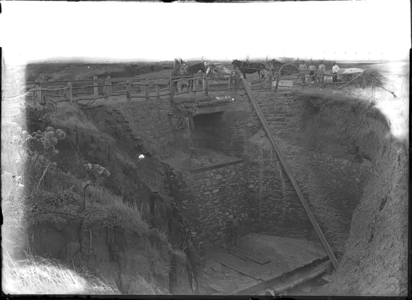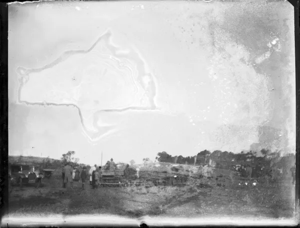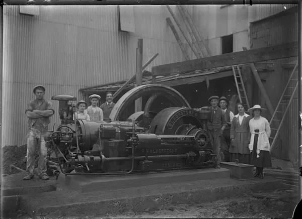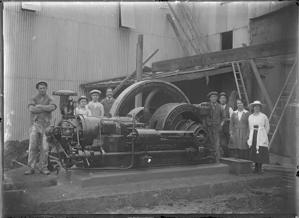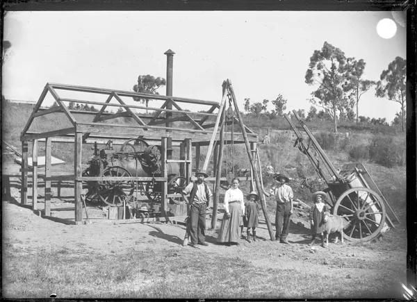 Work of ArtEdmund DiederichGroup gathered by timber frame enclosing machinery, sheep at rightc.1890-1923