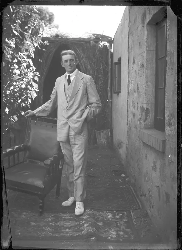 Work of ArtEdmund DiederichGentleman, one hand in pocket, the other on chair back, foliage at leftc.1890-1923