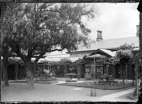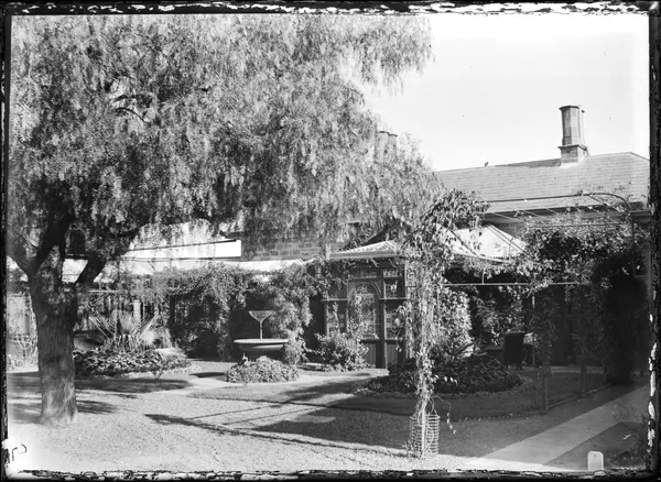 House garden, fountain at centre left