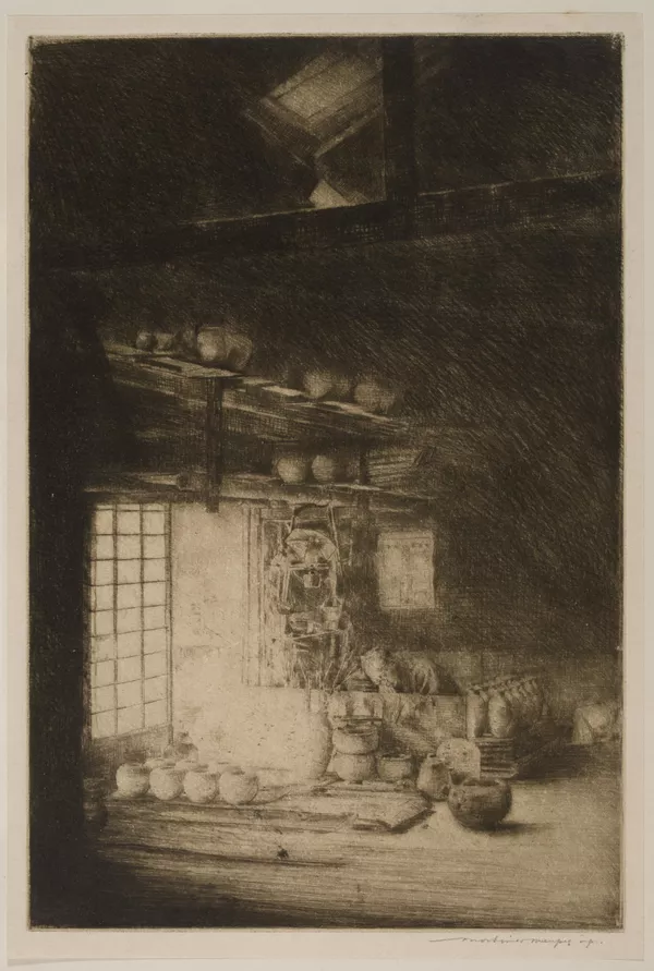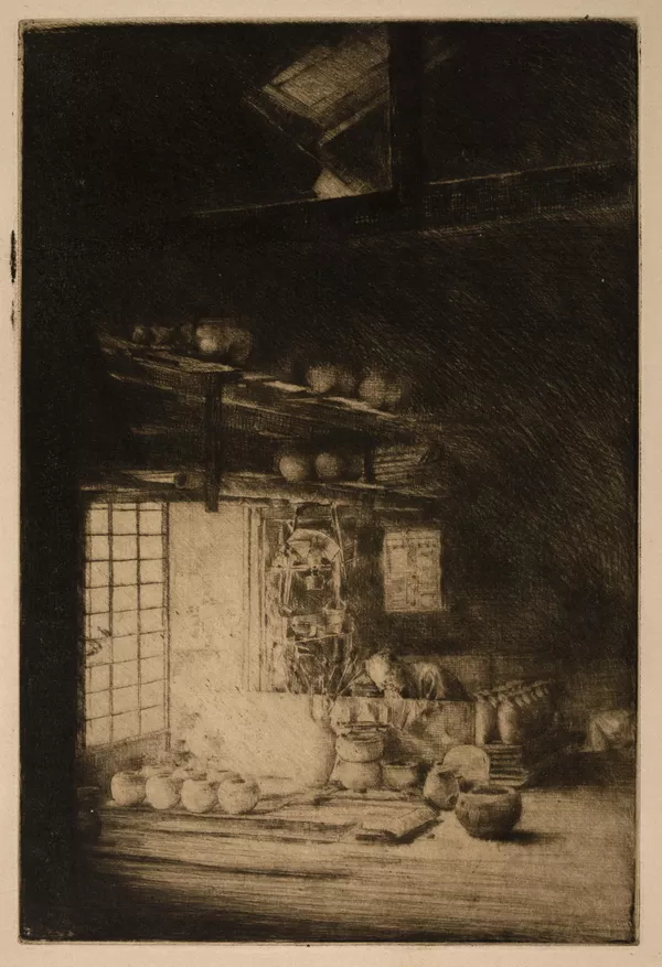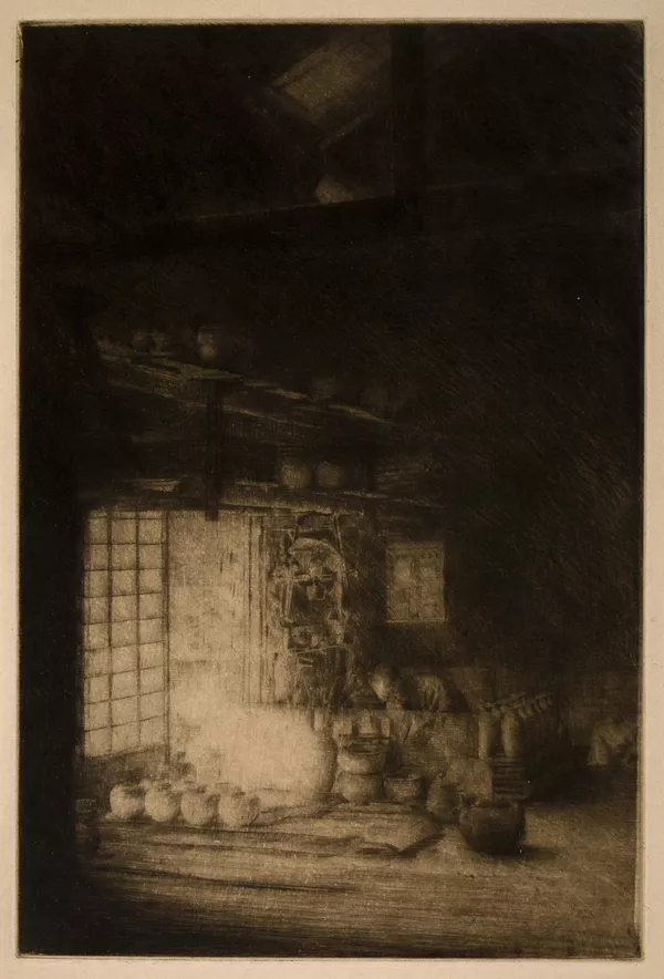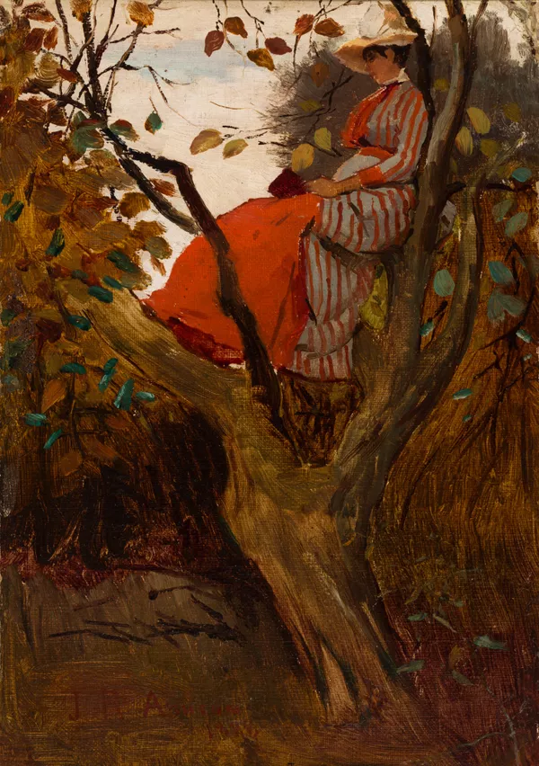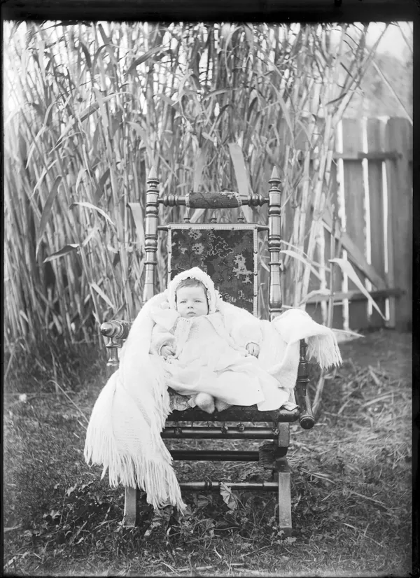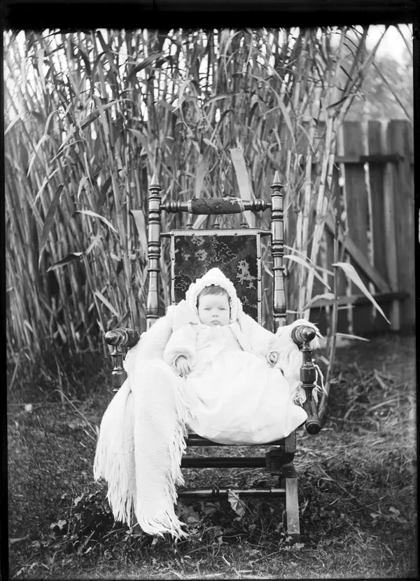 Work of ArtUnknownBaby in outdoor surrounds, blanket falling at left, bamboo plant in backgroundc.1900-10