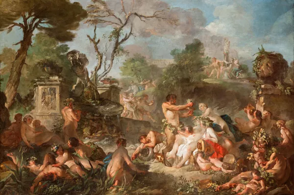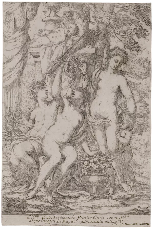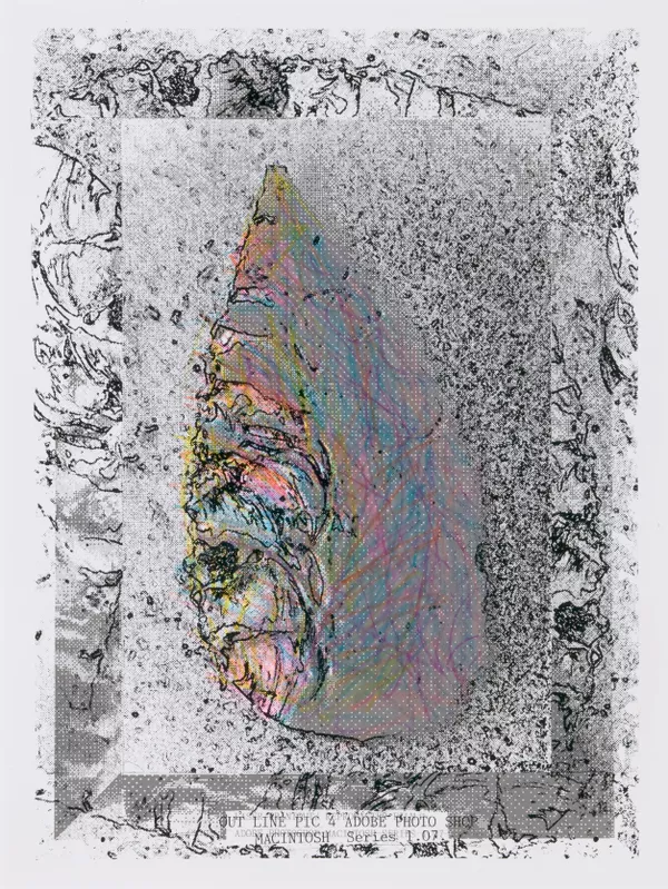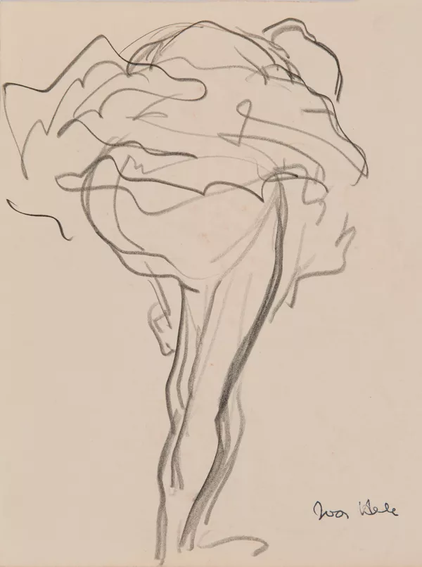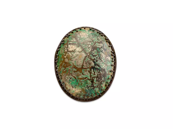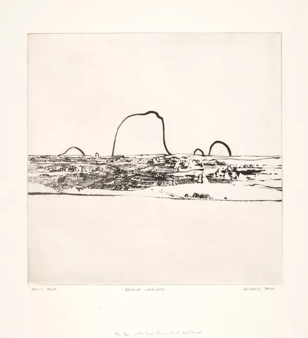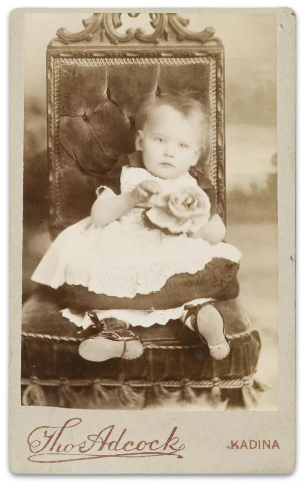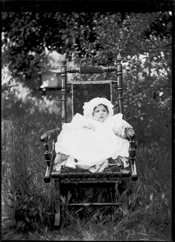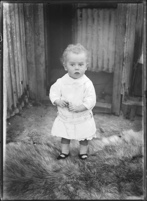 Baby standing on fur skin rug, sheets of corrugated iron at rear