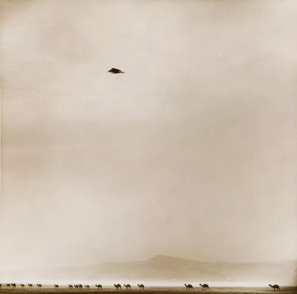 Beginning of the Hindu Kush in the distance with camels running in front of a sandstorm