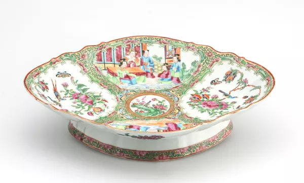 Begonia dish, with four cavetto cartouche depicting 'bird and flower' and figurative scenes