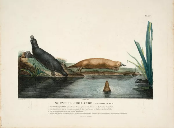 New Holland: New South Wales. Brown platypus. Red platypus. (Nouvelle-Hollande: Nouvelle Galles de Sud. Ornithorinque brun. Ornithorinque roux.)