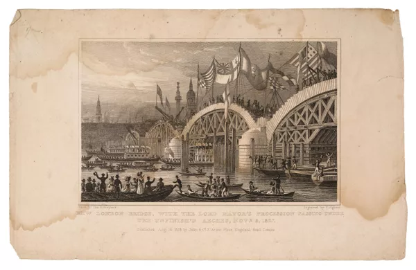 New London Bridge with the Lord Mayor’s Procession passing under the unfinish’d arches, Novr 9 1827