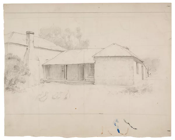 Study of Colonel Light's residence at Thebarton, S.A., showing a side view of the back rooms.