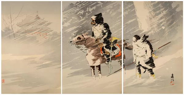 Braving a blizzard a lone Japanese officer reconnoitres enemy positions (Ōyuki o okashite waga shōkō tanshin tekichi o teisatsu no zu)