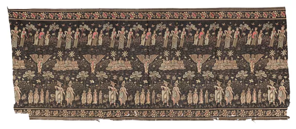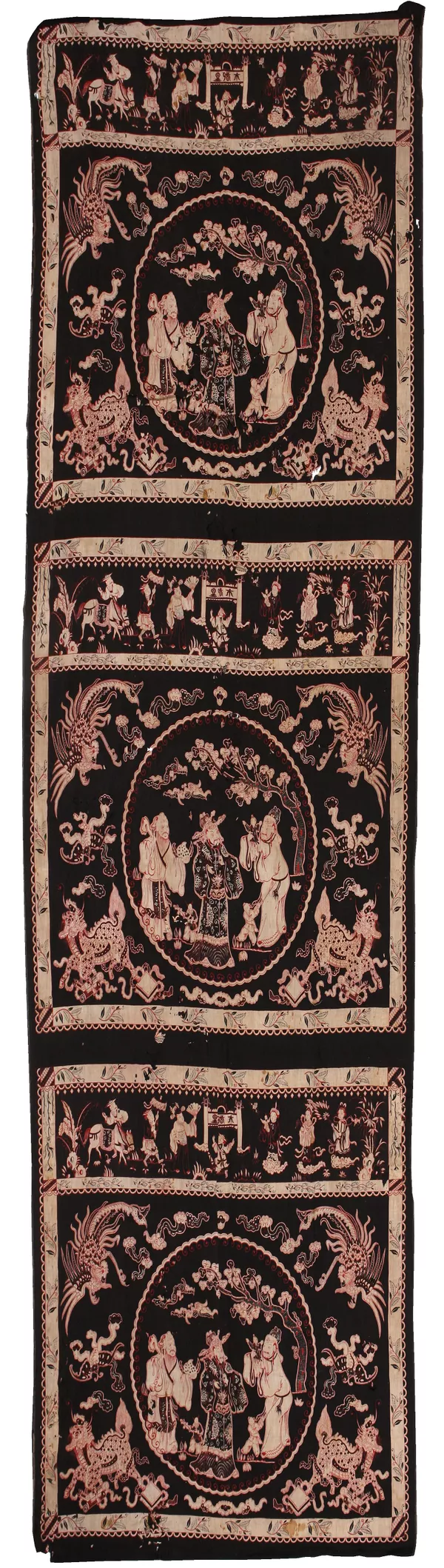 Cloth with six panels depicting Chinese altar valance (tokwi) with Three Star Deities (Sanxing)