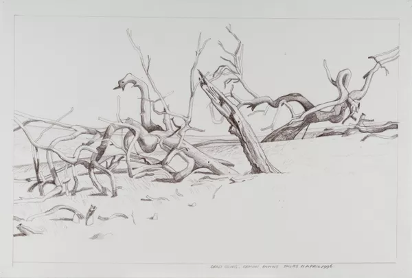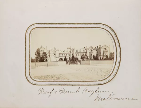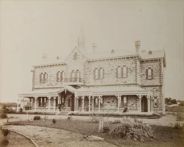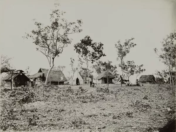 Distant view of the landing place and iron stores at Port Adelaide with the South Australian Company's storeship Sir Charles McCarthy at anchor