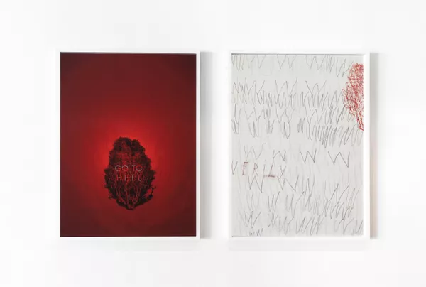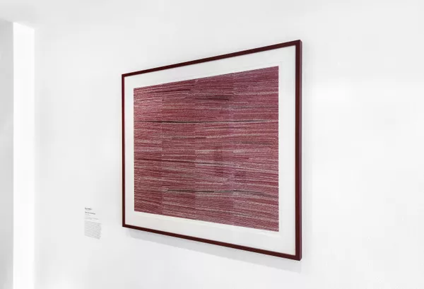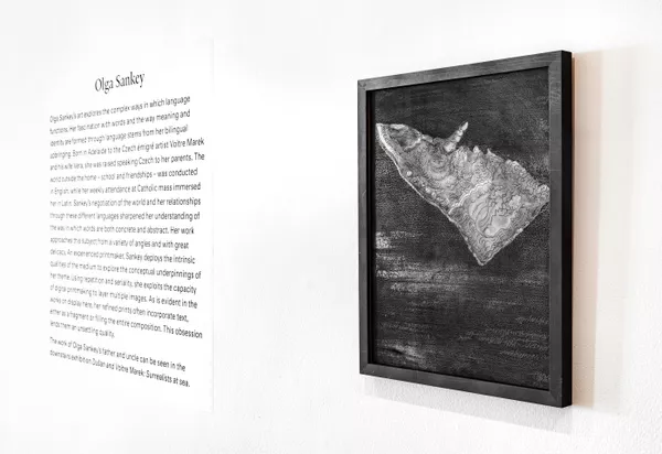 Olga Sankey’s art explores the complex ways in which language functions. Her fascination with words and the way meaning and identity are formed through language stems from her bilingual upbringing. Born in Adelaide to the Czech émigré artist Voitre Marek and his wife Vera, she was raised speaking Czech to her parents. The world outside the home –school and friendships – was conducted in English, while her weekly attendance at Catholic mass immersed her in Latin. Sankey’s negotiation of the world and her relationships through these different languages sharpened her understanding of the way in which words are both concrete and abstract. Her work approaches this subject from a variety of angles and with great delicacy. An experienced printmaker, Sankey deploys the intrinsic qualities of the medium to explore the conceptual underpinnings of her theme. Using repetition and seriality, she exploits the capacity of digital printmaking to layer multiple images. As is evident in the works on display here, her refined prints often incorporate text, either as a fragment or filling the entire composition. This obsession lends them an unsettling quality.