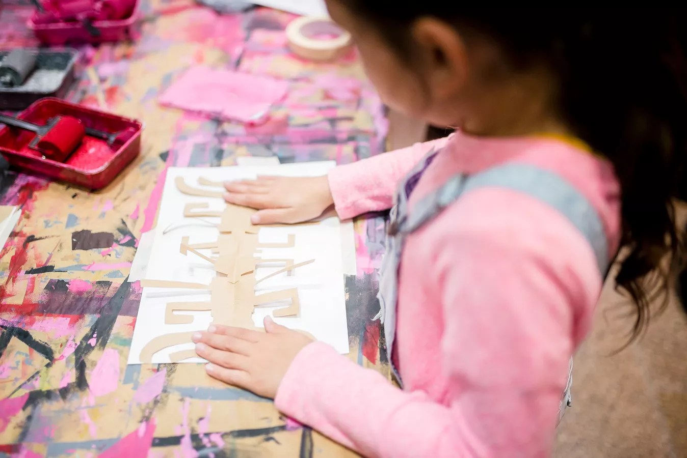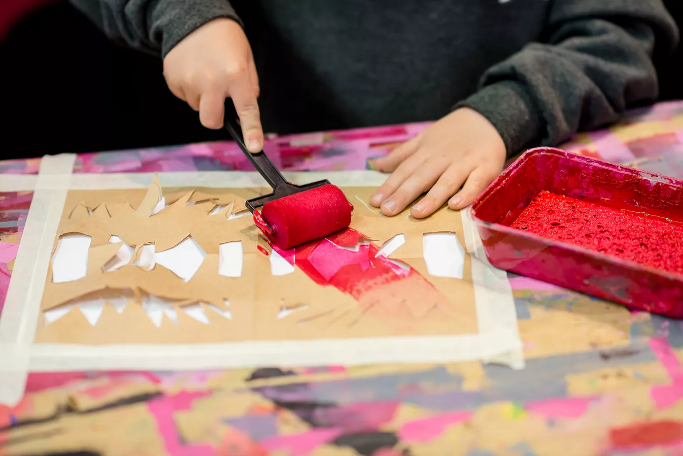 The Yirrkala Print Space in Arnhem Land is a place of creative excellence where artists work in a variety of print mediums. For Tarnanthi, Yolŋu printmakers bring their vibrant energy from the Yirrkala Print Space, a place of fun and loud music, to The Studio in Adelaide. Visitors can take part in a range of printmaking activities at the Studio, which takes its visual cues from the magenta-hued paintings and prints of senior Yolŋu artist Noŋgirrŋa Marawili.