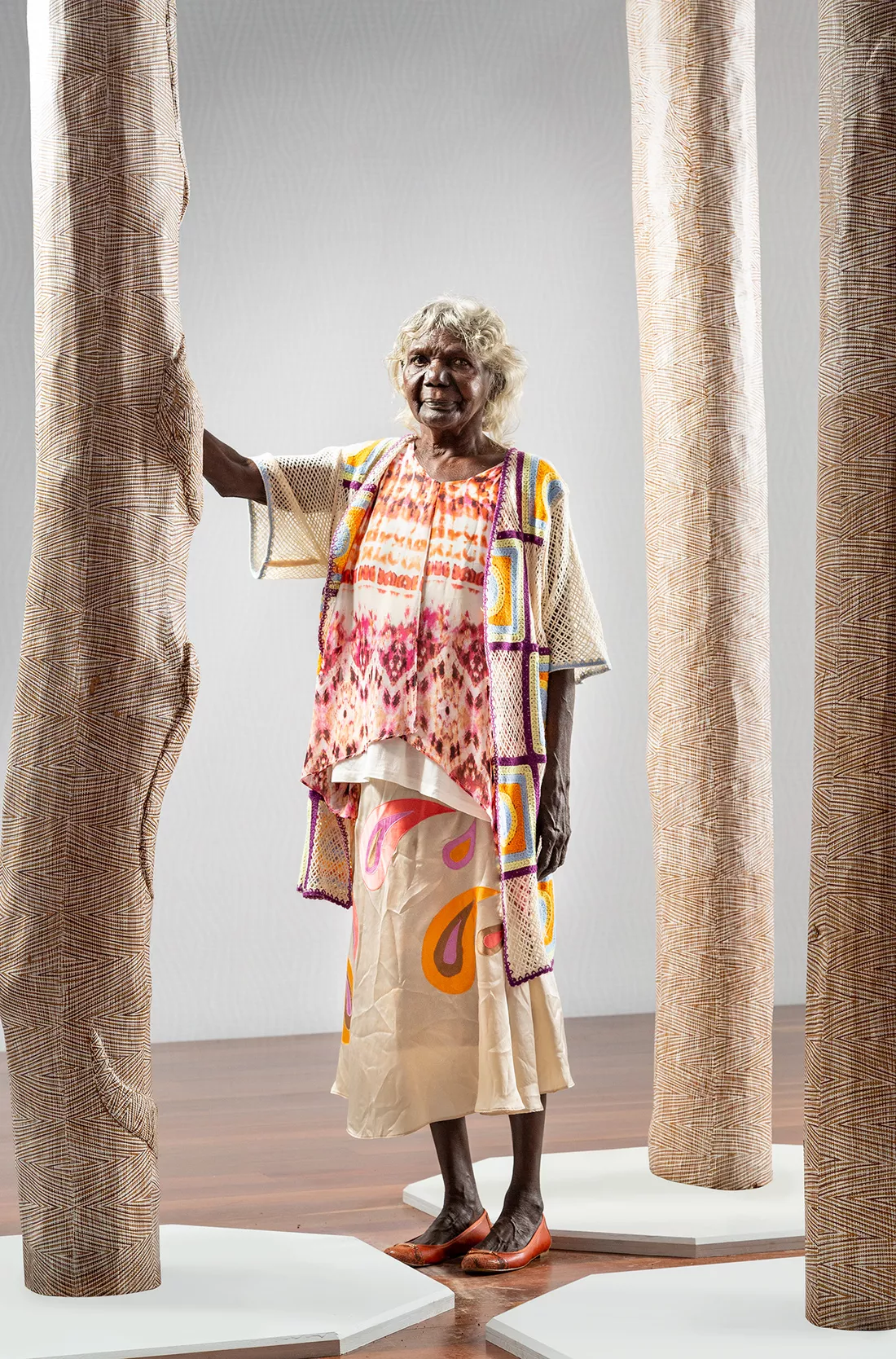 Her practice reflects a deep engagement with Yolŋu cultural knowledge, particularly through painting and ceremonial traditions. After many years working on canvas, she has expanded her practice to include bark painting and larrakitj (memorial poles) at Buku-Larrŋgay Mulka.