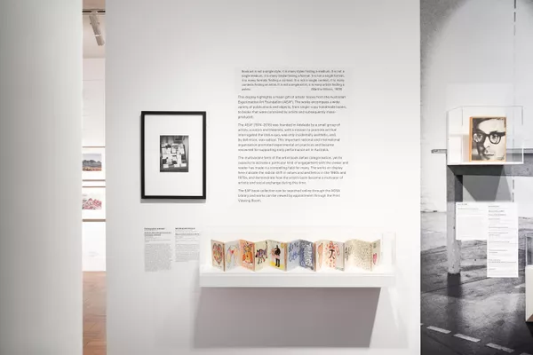 This display highlights a major gift of artists’ books from the Australian Experimental Art Foundation (AEAF). The works encompass a wide variety of publications and objects, from single-copy handmade books, to books that were conceived by artists and subsequently mass-produced.