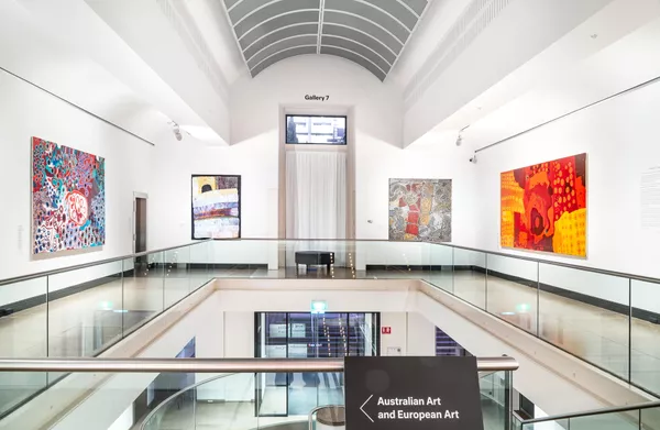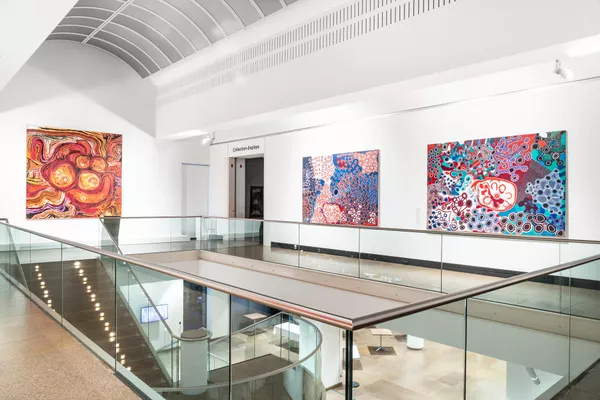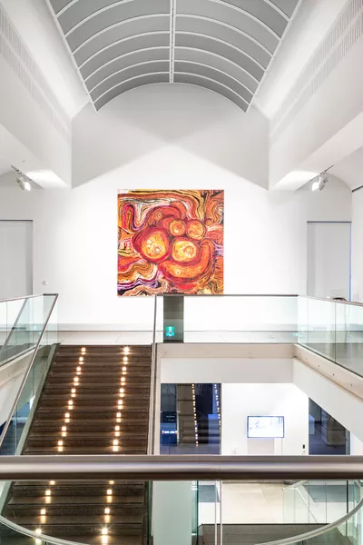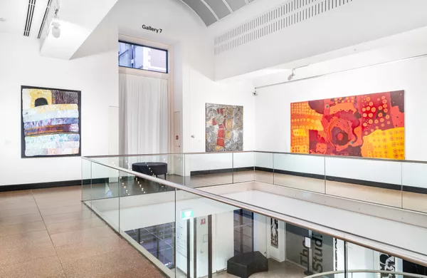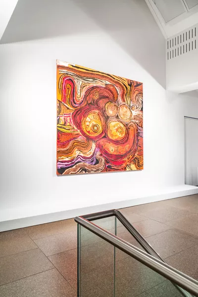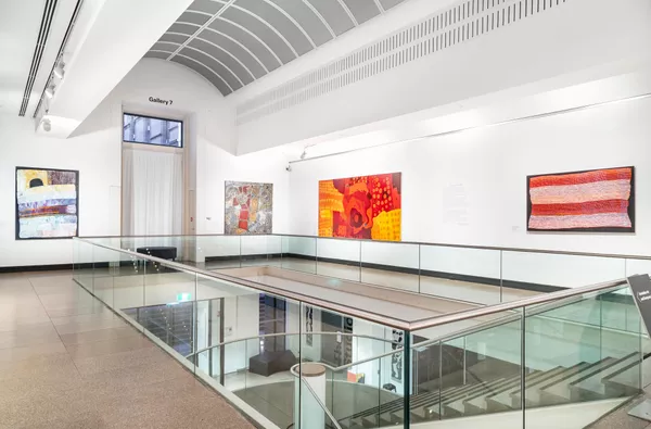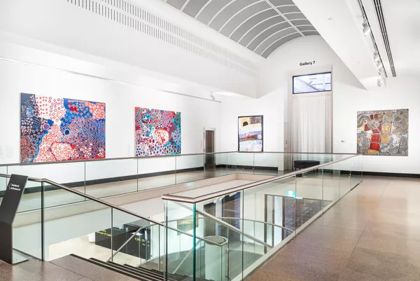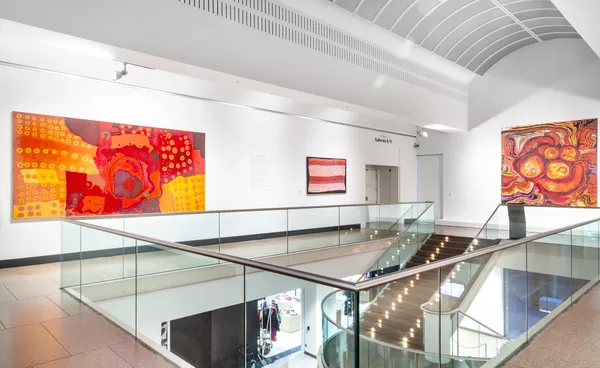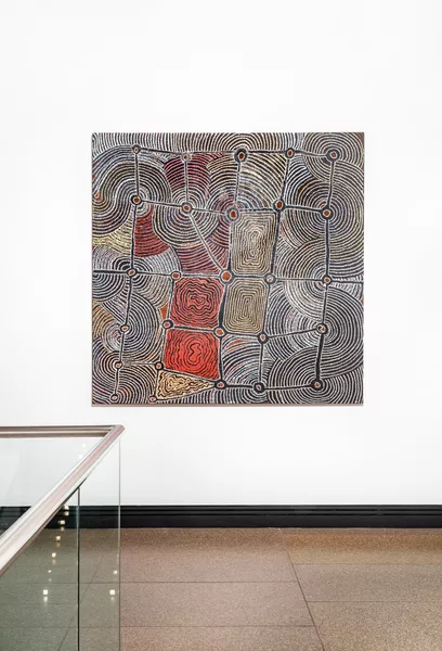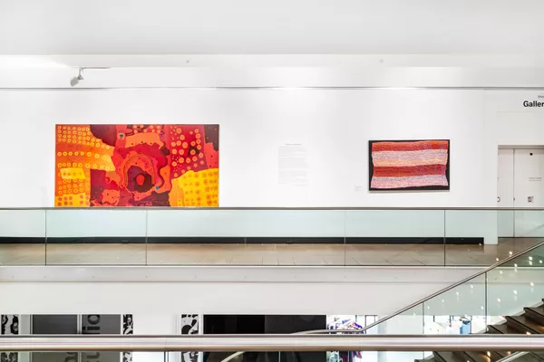 Most of the paintings in this display are by artists from the Aṉangu Pitjantjatjara Yankunytjatjara (APY) Lands who live in communities across the northwest of South Australia. Also included are two impressive large scale collaborative paintings, one painted by men and the other by women artists known collectively as the Spinifex Arts Project. These artists are also Pitjantjatjara people, who were relocated to Western Australia from Maralinga, Emu Junction and other locations in South Australia during the atomic bomb testing on their sacred land during the 1950s.