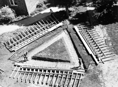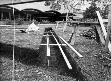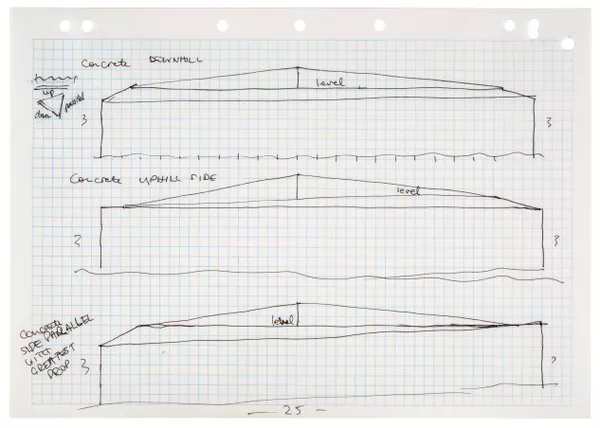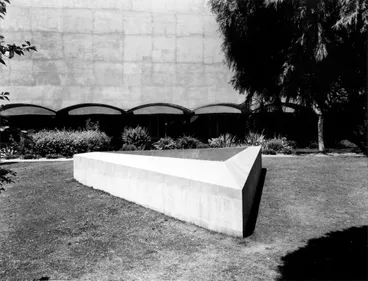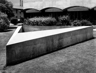 Believing the new site to be flat, Judd began to conceive ideas for the work at AGSA – only to dispense with them when he reached Adelaide and discovered a gentle slope. While in the city in May 1974, he made new drawings and pegged out the ground. His envisaged steel became concrete, shape became triangular, and its slanting topmost surfaces reflected the unexpected lie of the land.
