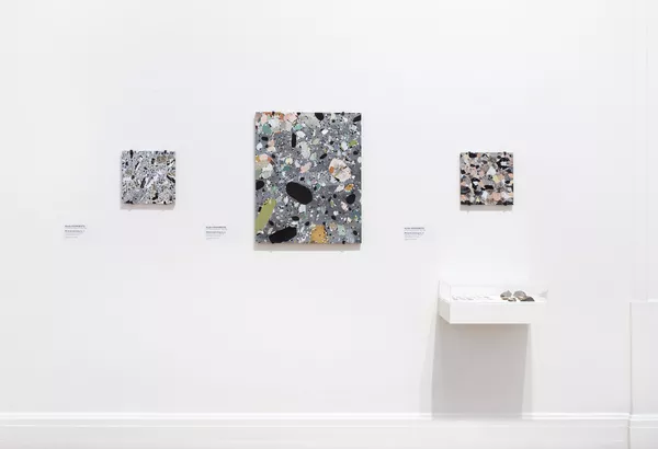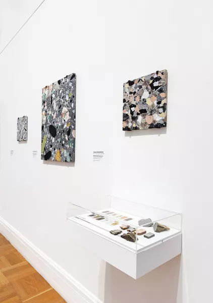 Similarly, rocks from her garden were pounded to create paints. The imagery of her abstract paintings was inspired by the petrographic structure of those rocks, their appearance captured by microscopy at a specialist laboratory in Adelaide. The geological formation of the land on which Hashimoto works was revealed through the wafer-thin slices of rock pressed onto glass plates.
