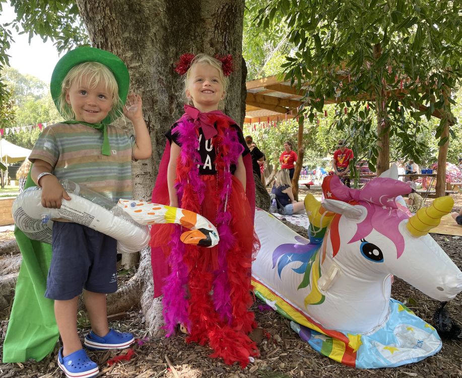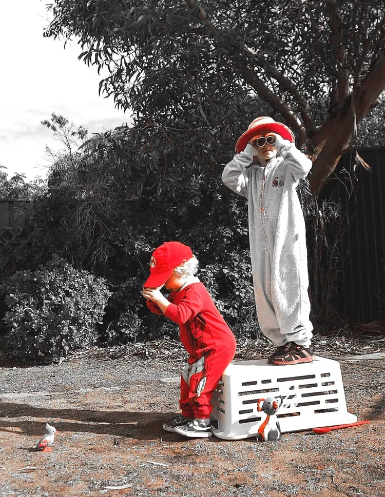 Amandine Bachmann Caire, Birdwatching in our yard. Marius: 'What's that big bird making clicking noise?' Malina: 'It's mummysaurus with a camera.'