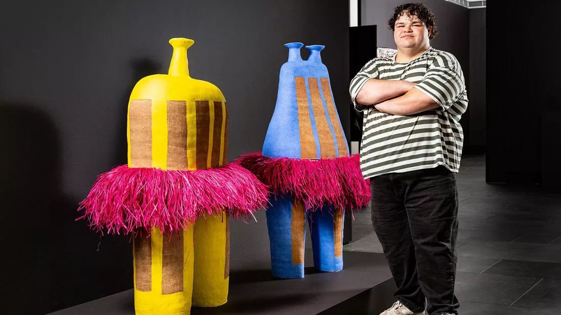 Alfred Lowe’s practice, which is concerned with contemporary ways of navigating and manifesting identity and culture, is influenced by both the beautiful landscape of Central Australia, where he grew up, and its often-charged politics. These opposing ideals of beauty and pain fuel the artist’s exploration of what it means to exist simultaneously in two conflicting extremes. By using radically contrasting materials, textures and colours, Lowe explore what it means to exist outside binary ideals.