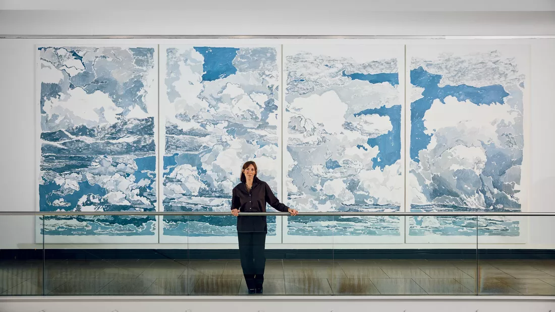 February Thirteenth references a formation seen by Adolphs as it moved past her house on a summer’s day in February 2024. Adolphs’s intention was to create an immersive experience of a moment in time. Her monumental paintings take us on a journey across the sky, just as she had experienced on that summer’s day.
